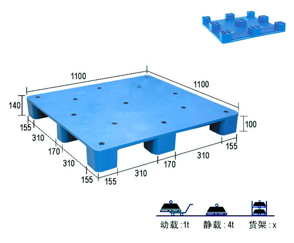 編 號:GK23-1111九腳平板塑料托盤 外尺寸(mm):1100*1100*140 內(nèi)尺寸(mm): 動 載(T):1 靜 載(T):4 貨 架(T):×